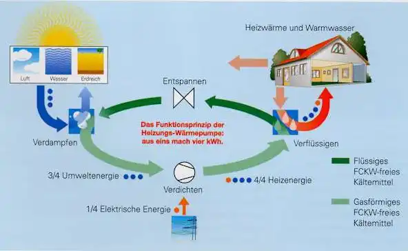 Heizungs-Wärmepumpen übertragen die in einem Verdampfer gewonnene Wärme aus der Umwelt auf ein FCKW-freies Arbeitsmedium.
